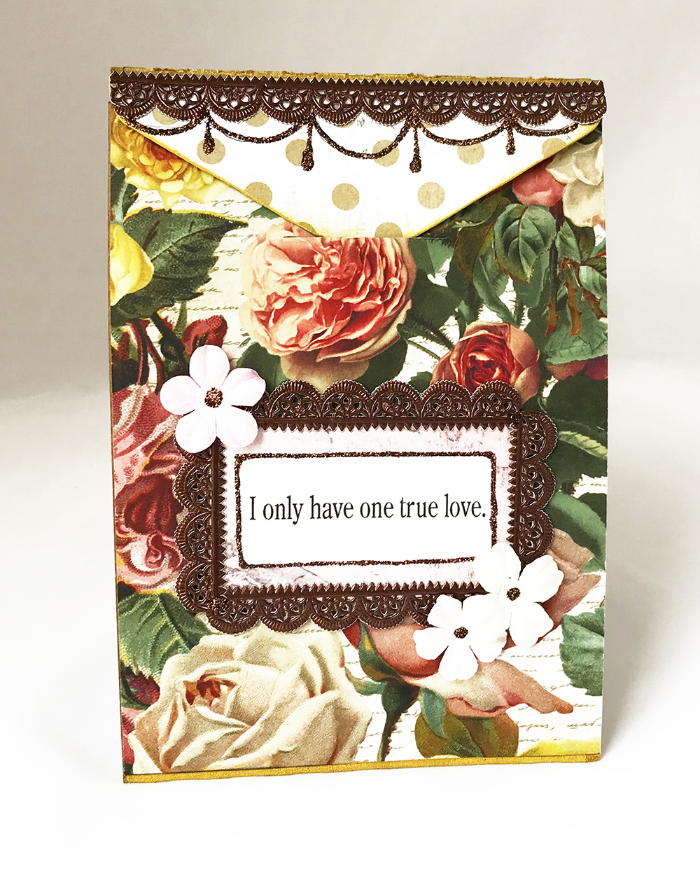 A couple of pretty little paper flowers on the front and a couple drops of glitter in the centers and it's all good to go!